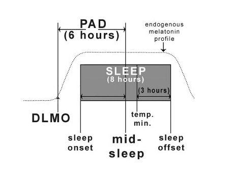Ulti­mate­ly, patients with win­ter depres­sion most gen­er­al­ly exhib­it altered onset dura­tion and off­set of mela­tonin secre­tion as com­pared to healthy sub­jects – typ­i­cal­ly, a lat­er DLMO and there­by a short­er phase-angle dif­fer­ence (PAD), defined as the inter­val between DLMO and mid-sleep. (Lewy, 2006; Ter­man, 2001)